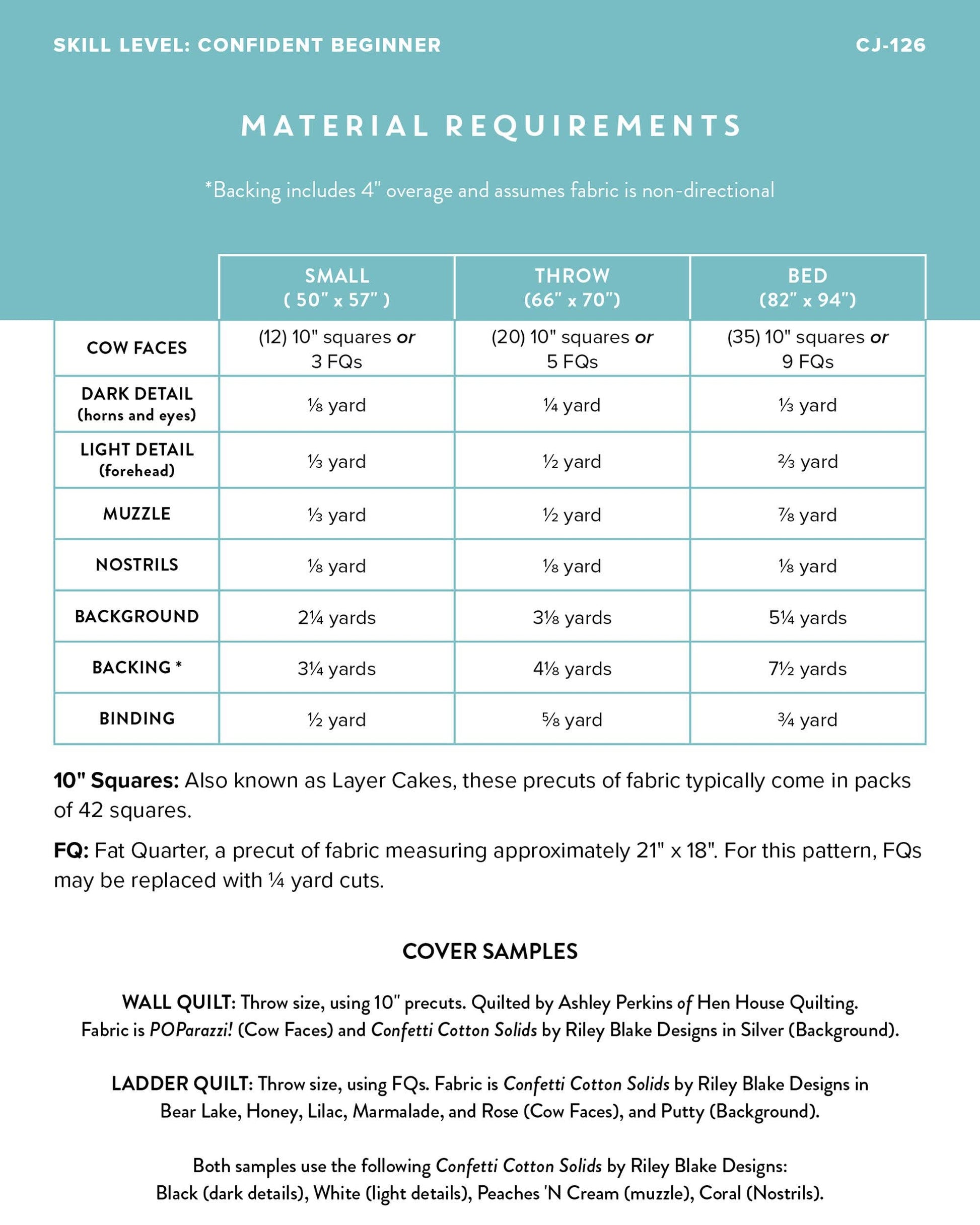 She's quirky, she's fun - meet Annabelle. This traditionally pieced quilt pattern features a playful and modern cow design. Get creative and let your imagination run wild with two fabric options - layer cakes or fat quarters - and three sizes. Pattern includes helpful diagrams, detailed instructions, and a Color-Your-Own page to help you decide your fabric choices.