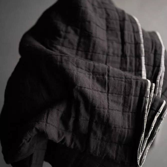 A slightly washed out black. This layered cotton has a jacquard weave that gives it a quilted look and feel. The reverse is a gauzy cotton, there is no batting in the middle of this cloth, the inside is made up of a series of thicker yarns which gives it the quilted feel. The top is a fine cotton. 120cm wide. 100% Cotton. 11.5oz, 396gsm. Country of origin; India. There may be some white slubs throughout the cloth, these are not flaws. Wash cool. Do not tumble. Shake out and dry flat. Iron cool. There will be colour variations between pieces. There may also be colour graduation over the piece. For the first couple of washes, place the fabric in the washing machine drum at 30 or 40 degrees with a handful of table salt. This will help fix the dye to prevent it running.